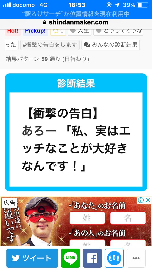 あろー 「私、実はエッチなことが大好きなんです!」#衝撃の告白をします https://shindanmaker.com/860507 pic.twitter.com/4lh5YWbTUl— (@arrow485) 1:54 – 2019年1月23日