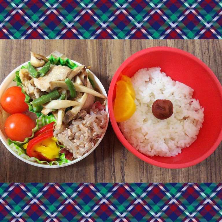 鶏胸肉とエリンギソテー、タラコのしらたきのバター炒め、とまと、パプリカピクルス、梅干し、沢庵