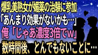 【馴れ初め】爆乳美熟女が媚薬の治験に参加したら「あんまり私には効果が出ない様ですよ…」俺「では濃度3倍でw」→数時間後、とんでもないことになったwww【感動する話】